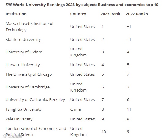 商业与经济学全球排行榜中,清华大学进入前10,其余都是美国和英国的高校: