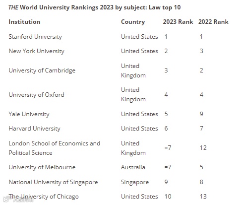 法学领域,全球榜单前10的院校如下: