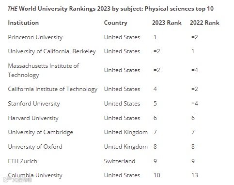 物理科学领域,全球榜单前10的院校如下: