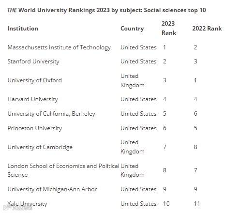 社会科学领域,全球榜单前10的院校如下: