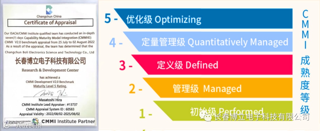 2022年,博立科技通过了CMMI 5级认证,这是自2019年3月通过CMMI 4级认证后,博立科技在产品研发、创新实力、管理和服务水平等综合实力方面获得权威认可的又一重要里程碑。标志着博立科技在软件研发、过程组织能力、项目管理能力、方案交付能力等方面达到了优化管理级的先进水平,拥有能够为市场提供更成熟、更优质产品和服务的顶尖技术水平。
