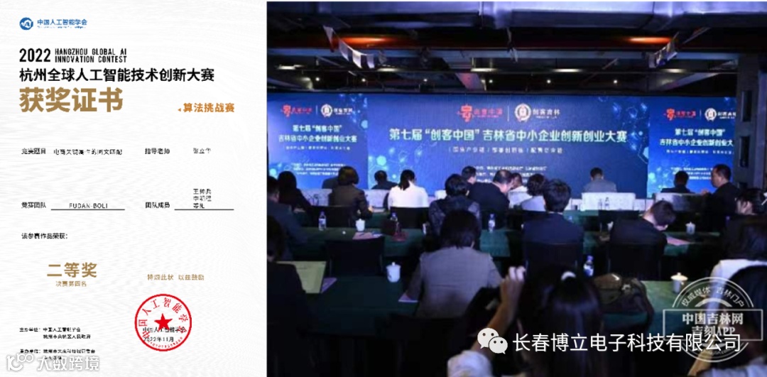 2022年,博立科技与复旦大学共同组队,参加了2022全球人工智能技术创新大赛算法挑战赛并荣获二等奖(决赛第四名)。博立科技还参加了第七届“创客中国”吉林省中小企业创新创业大赛,荣获企业组三等奖。两个奖项充分证明了博立科技在技术创新与商业模式创新两方面的优秀能力。