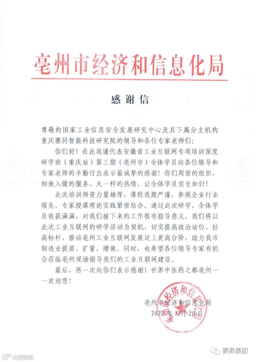 重庆赛昇收到亳州经信局发来感谢信