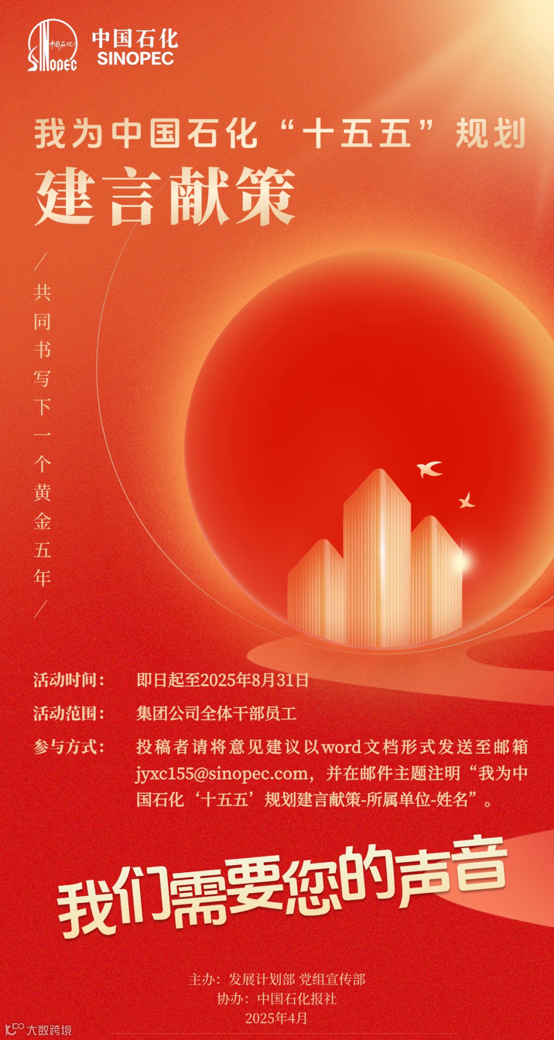 投稿者请将意见建议以word文档形式发送至邮箱jyxc155@sinopec.com,并注明邮件主题为“我为中国石化‘十五五’规划建言献策-所属单位-姓名”。