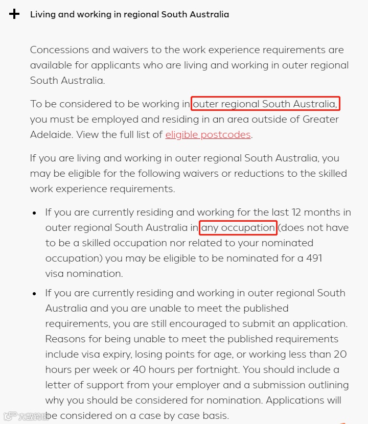 递交申请时正在南澳的偏远地区工作。如果申请人在Outer Regional工作,则不需要找相关提名工作,任何工作都有机会申请南澳491州担保。