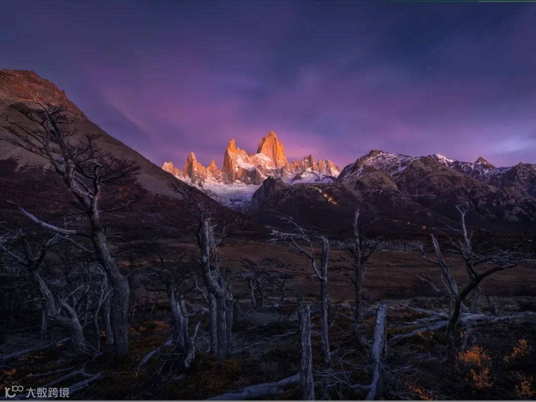 这张照片是在日出前一个半小时拍摄的夜景,地点位于巴塔哥尼亚的菲茨罗伊峰附近。由于拍摄时欠曝,原始RAW文件中的暗部几乎没有细节,但通过后期处理,即便光线极暗,树木等前景元素也能得到良好还原,在Lightroom中调整曝光值即可恢复暗部细节。