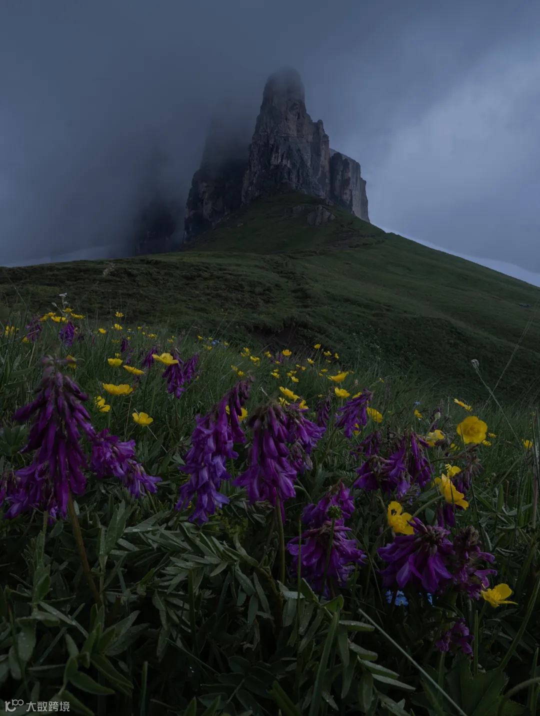 左边这张照片在拍摄时对焦在山上,近处的花会变得模糊;而右边这张照片对焦在花上,远处的山则变得模糊。