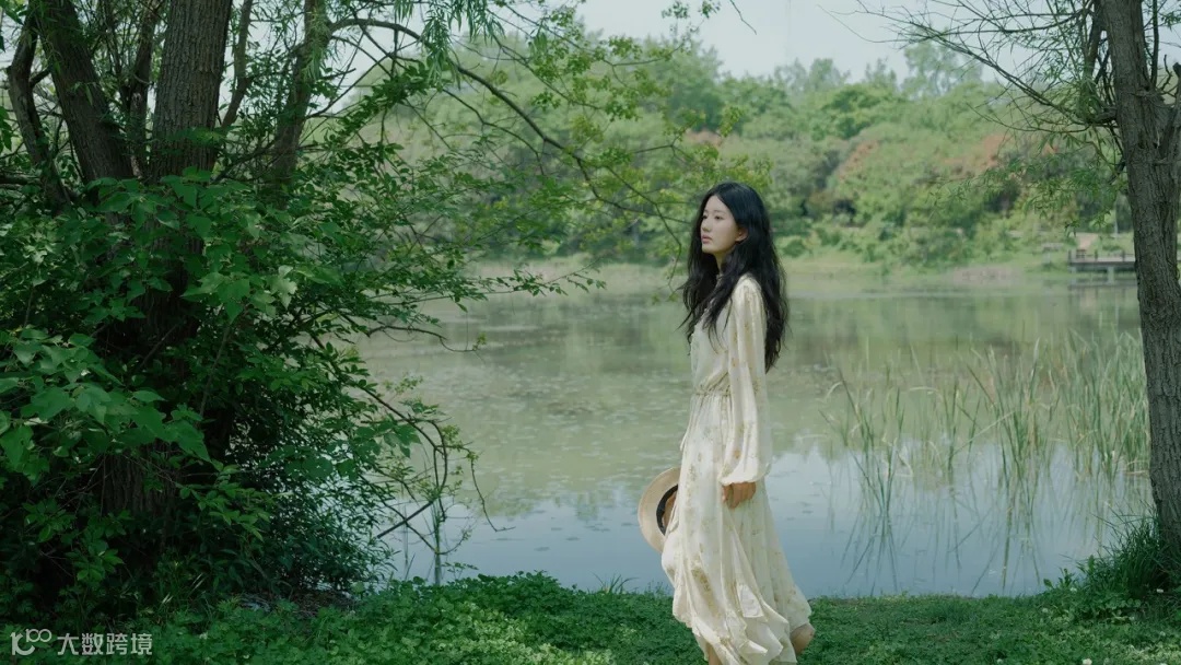 径直往前,在绿意的尽头是一湾安静的池塘,模特走在岸边,和绿叶与湖水互动,也能拍出安静的视觉感受。