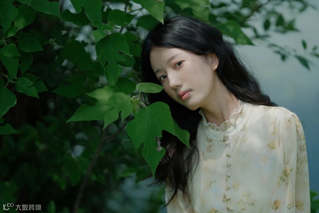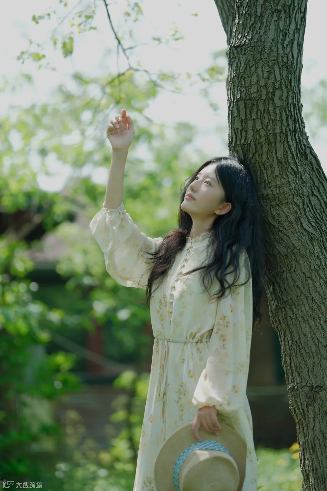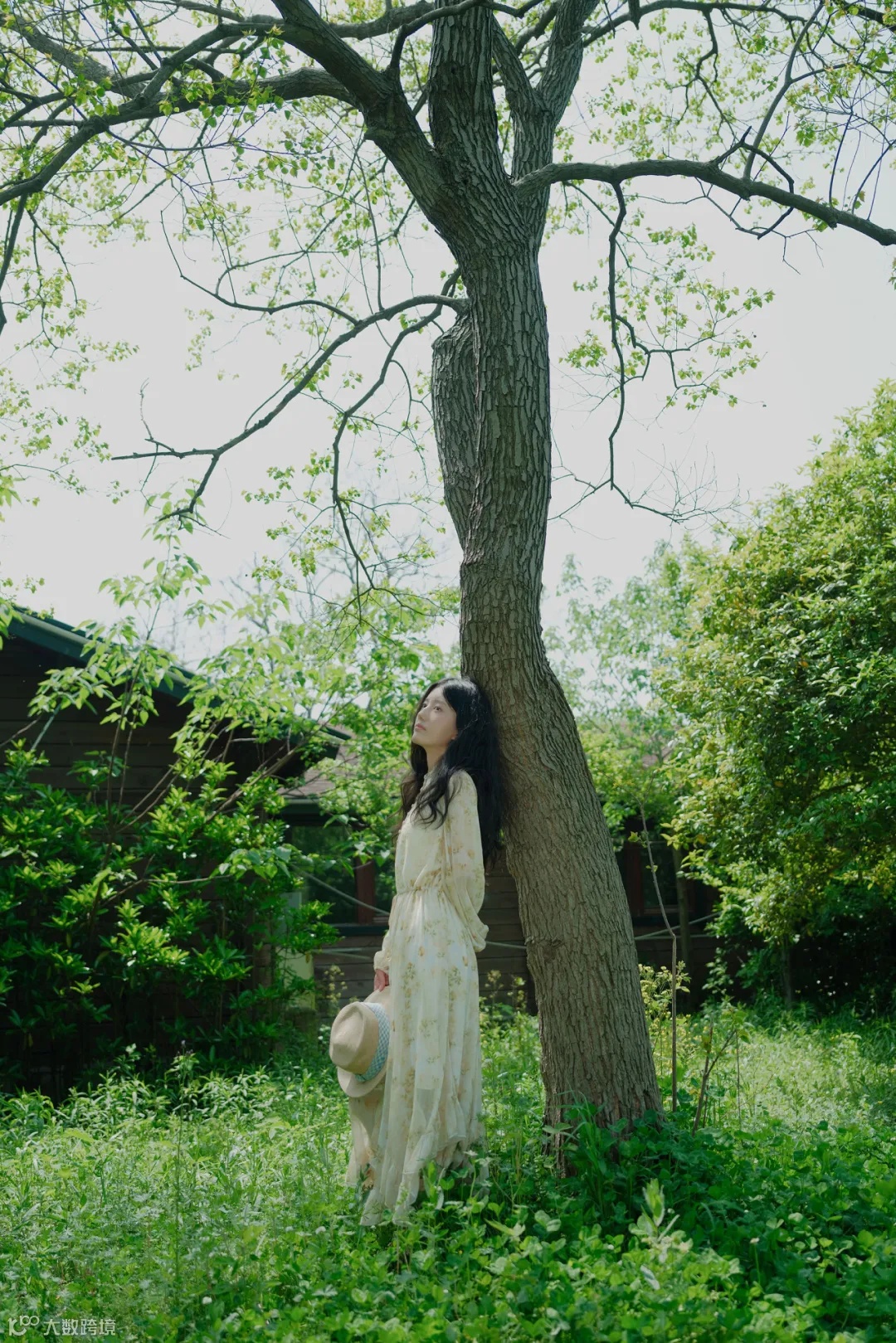 有一棵树已经发出了茂密的新芽,模特站在树下,感受阳光落在脸上的感觉,阳光透过树叶罅隙的感觉很好看。