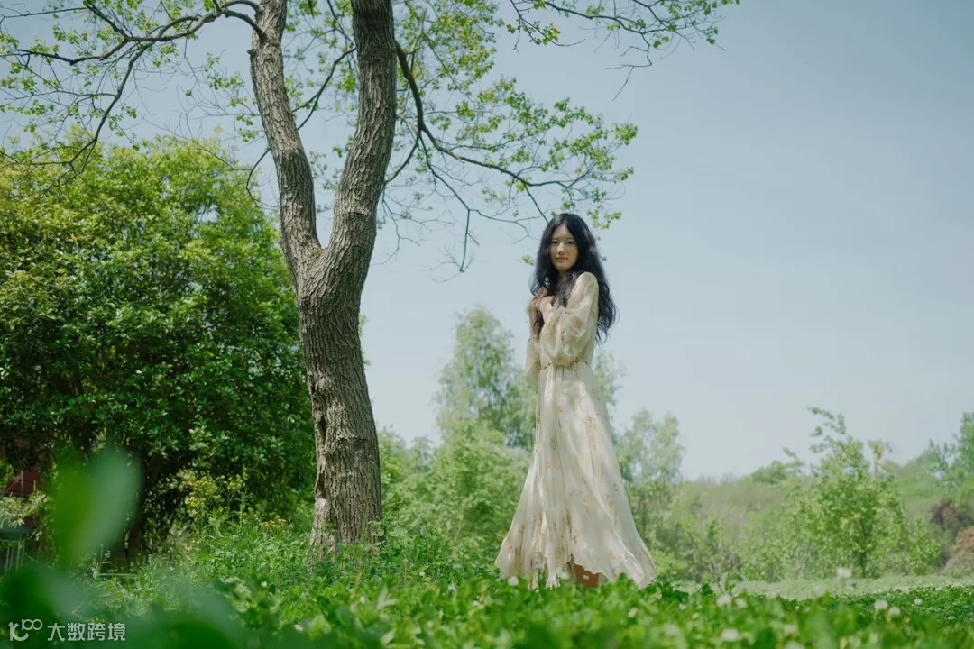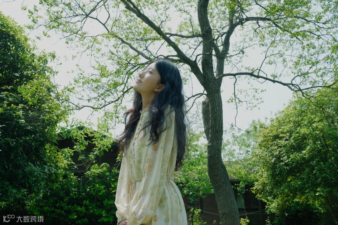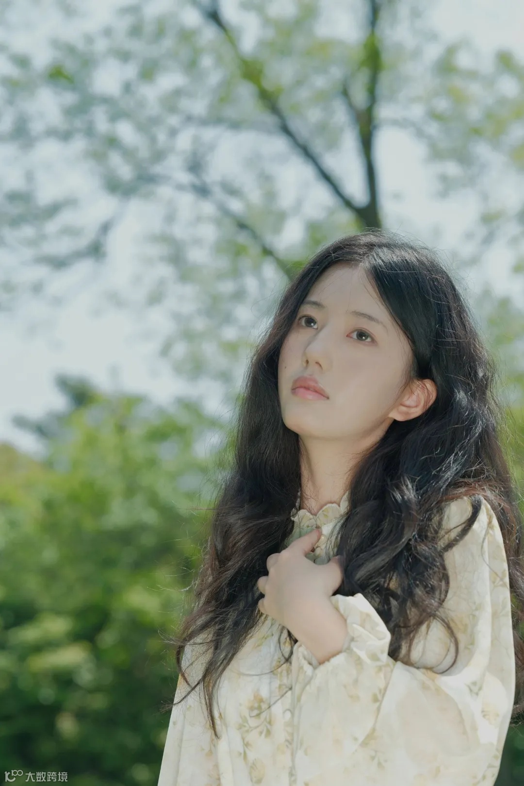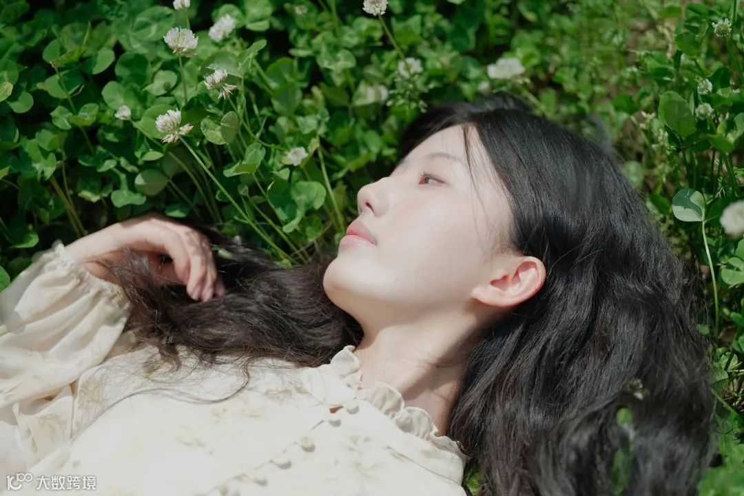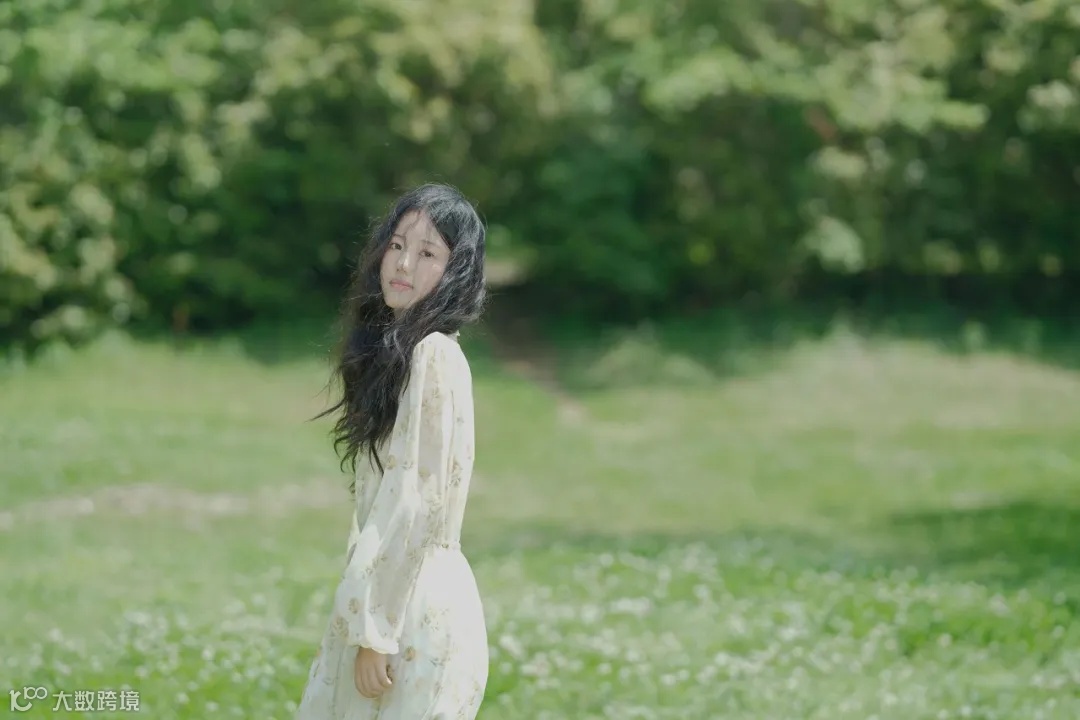 来到旁边的一处草坪空地,或是旋转,或是回眸,与自然深度互动,阳光也照亮了每根发丝,春日嫩绿的氛围全都在画面里。