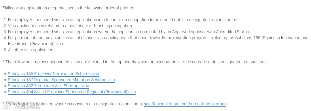 雇主担保类签证中,提名职业在偏远地区的申请享受最高审理优先级,186/482/494/187雇主担保签证被列入在指定地区从事职业的最高优先级; -