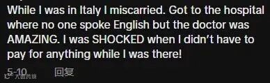 “我在意大利的时候流产了。到了医院,没有人会说英语,但是医生很棒。当我得知不需要支付任何费用的时候,我很震惊!”