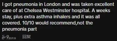 “我在伦敦得了肺炎,在切尔西威斯敏斯特医院得到了很好的照顾。住了一个星期,再加上额外的哮喘吸入器,一切费用都报销了。我满分推荐,不是指肺炎那部分。”