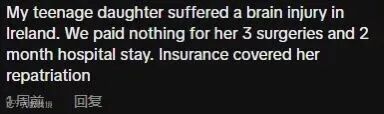 “我女儿在爱尔兰脑部受伤。我们无需支付她3次手术和2个月的住院费用。保险还覆盖了将她转移回国的费用。”