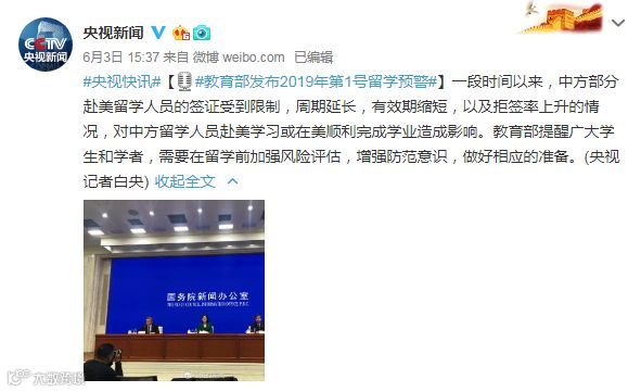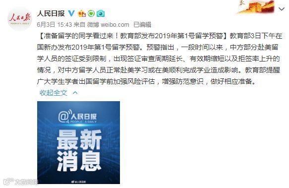 3日,教育部发布2019年第一号留学预警。教育部相关负责人介绍,一段时间以来,中方部分赴美留学人员的签证受到限制,周期延长,有效期缩短,以及拒签率上升的情况,对中方留学人员赴美学习或在美顺利完成学业造成影响,教育部提醒广大学生和学者,需要在留学前加强风险评估,增强防范意识,做好相应的准备。