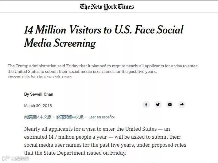 早在2018年3月,美国《纽约时报》报道称,特朗普政府为了加大对进入美国的外国人的审查力度,在2017年9月就宣布想收集申请人的社交网站信息进行审查。