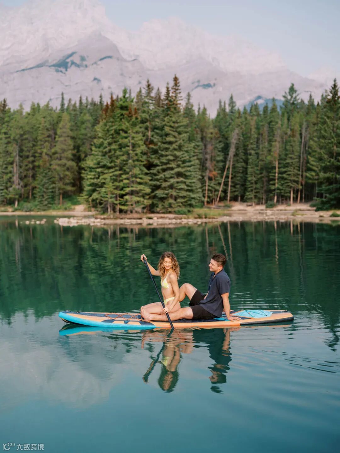 我和丈夫一起去班夫国家公园进行了一次拍摄,在到达拍摄现场之后,我们都认为这里非常适合桨板运动,所以我们就尝试了一次,我们来到了今天的拍摄地——杰克湖,这里的景色美不胜收,当时湖面处于背光位置,树荫也笼罩在湖面上,整个湖面散发出一种碧绿的色彩。