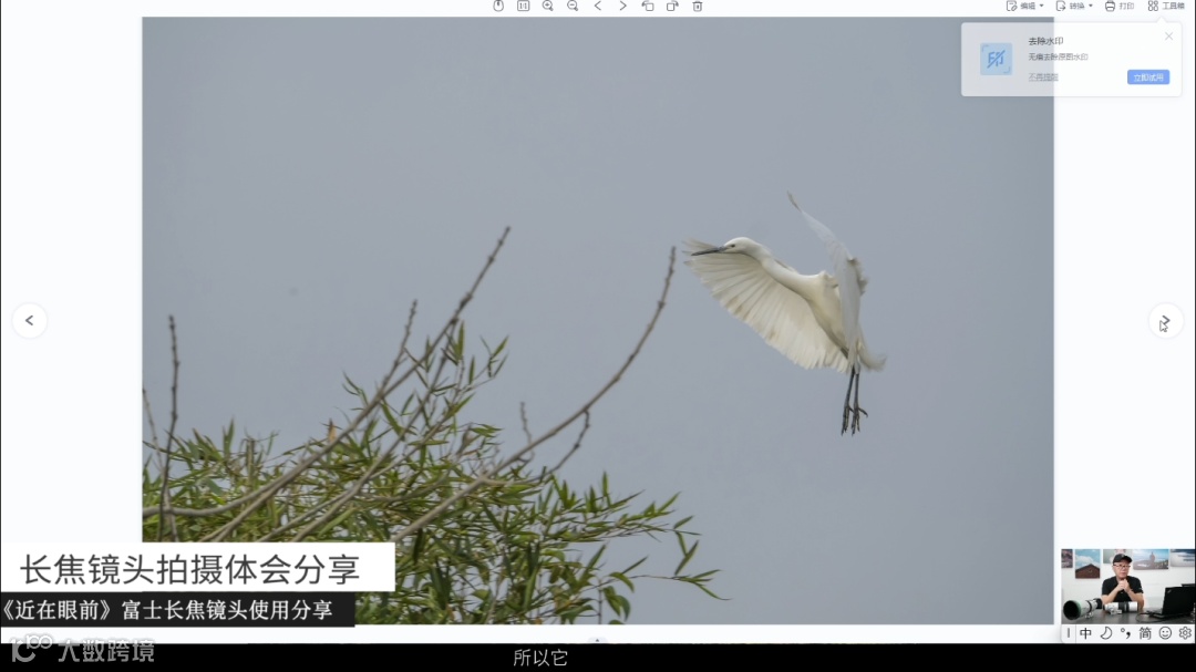 下图这个白鹭是手持拍摄的,用该镜头手持拍摄一些飞行中的鸟是非常棒的。这里讲一个知识点,不管镜头、相机怎么高端,在拍摄飞行的鸟类或者移动的物体时,快门速度是一定要跟上的,差不多要在1/500秒到1/1000秒的速度。