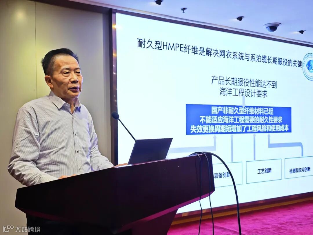 中国产业用纺织品行业协会绳(缆)网分会秘书长马海有作了“耐久型超高分子量聚乙烯纤维在深远海养殖、系泊缆等海洋工程应用发展前景”的报告。