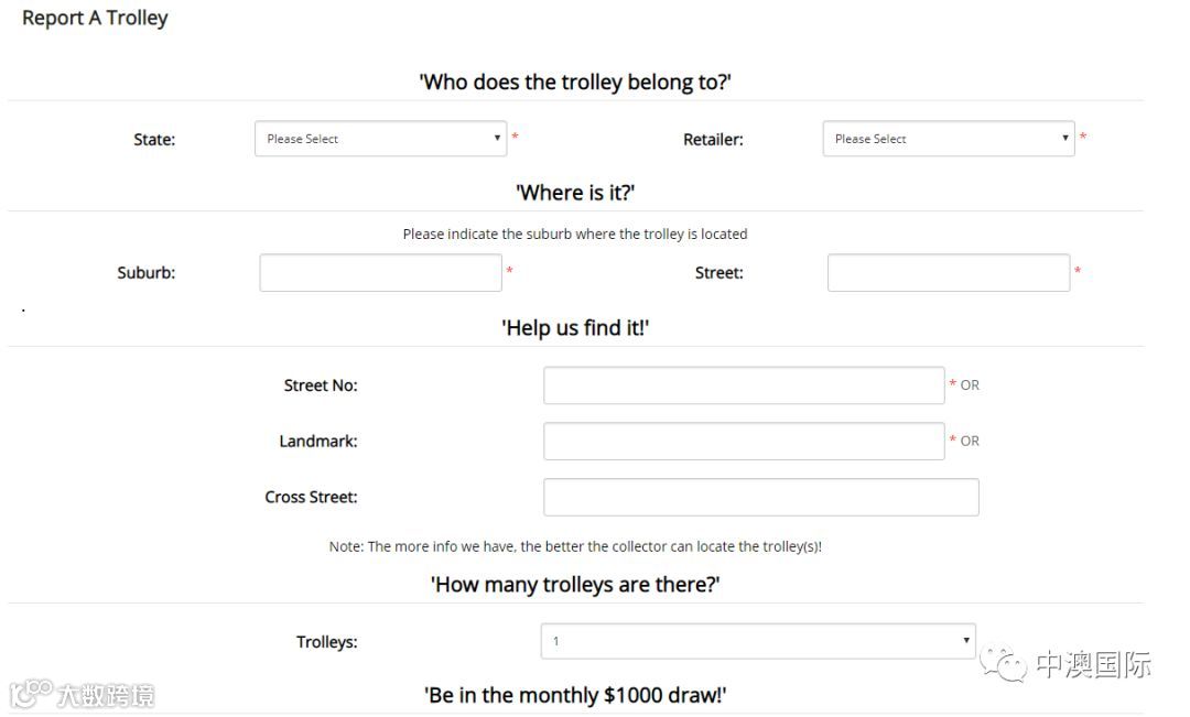 通过Trolley Tracker网站、应用程序或呼叫中心报告被遗弃手推车位置的顾客,将有机会分享该月的1000刀奖金,这笔钱可在手推车所在超市进行消费。