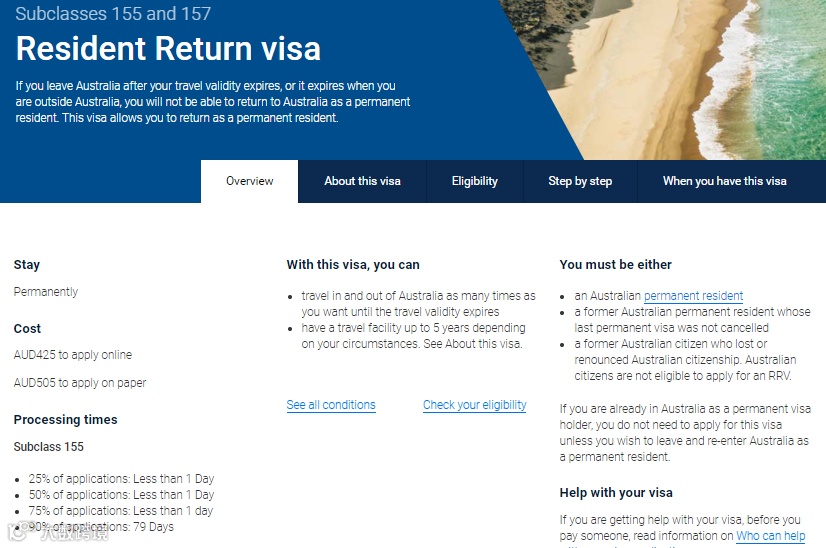 PR一般来说首次有效期限是5年,在这5年内可以自由出入澳洲。5年期满后,如果有计划离境或需要往返于中澳之间,则需要续签居民返程签证(Resident Return Visa,简称RRV),即很多人口中的“PR续签”,因为澳大利亚法律规定,任何非澳洲公民都必须持有签证才能进入澳洲。不过相比申请PR,申请RRV签证则要简单很多,通常情况下,只要满足居住时长要求即可获得RRV签证。