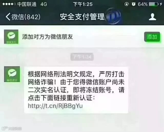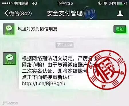 近日有不少微信用户反映,称其微信收到名为“安全支付管理”发送的消息,要求点击消息中的网址链接进行微信二次实名认证,否则将冻结其微信账号。