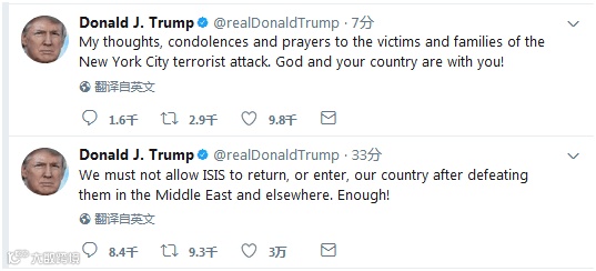 “向纽约恐袭的遇难者及其家属表达我的思念、哀悼和祈祷。”美国总统在纽约恐袭后发布推文表示,在击败中东或其他地方“伊斯兰国”(IS)恐怖组织后,不会允许其进入美国本土。