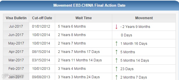 自从今年财政年度(2016年10月)开启以来,中国籍普通学历工作者的EB-3申请排期一直顺利前进,从2013年1月一直前进到2014年10月,八个多月的时间往前走了近两年的路,甚至比中国籍的硕士及以上高等学历工作者的EB-2要快一年半以上。这让很多EB-2申请者不服气,“明明学历更高,但却等的更久”,他们纷纷“自降身价”(downgrade),降级到EB-3项目。