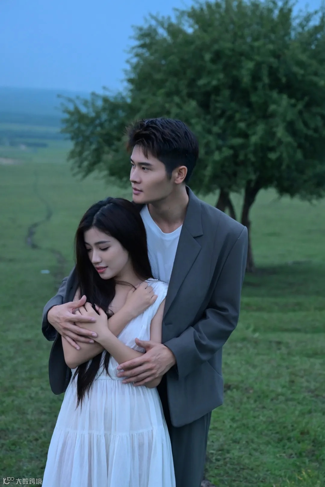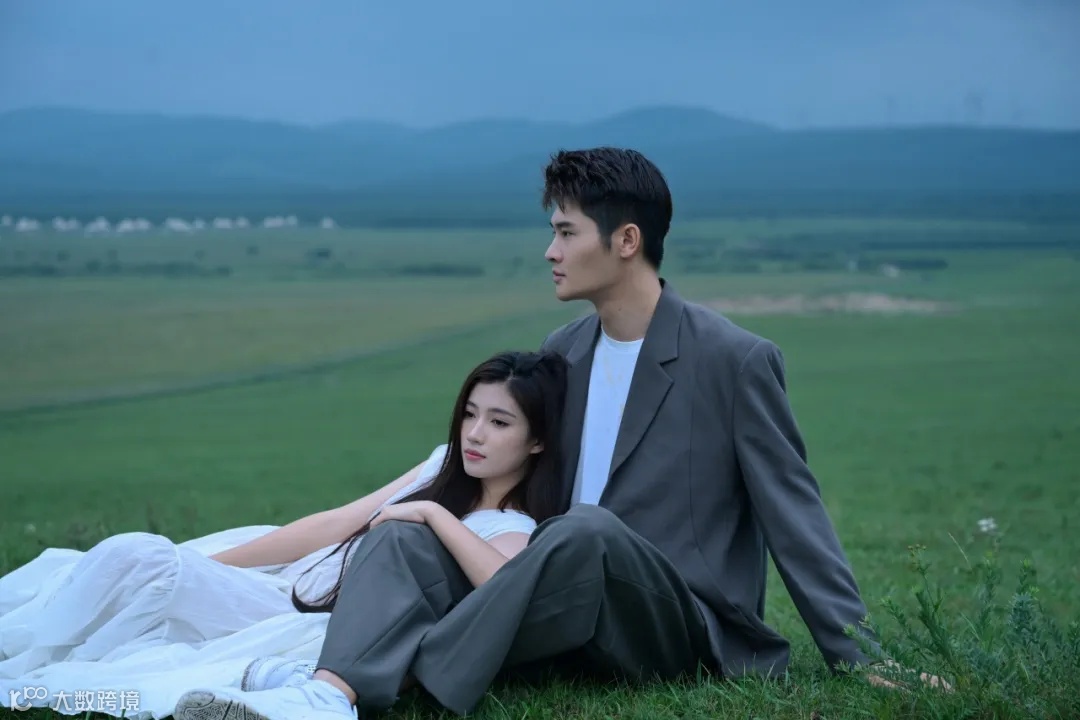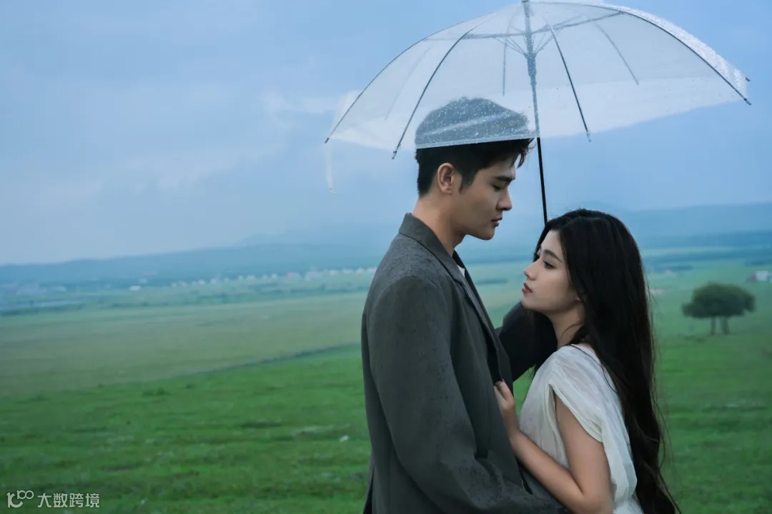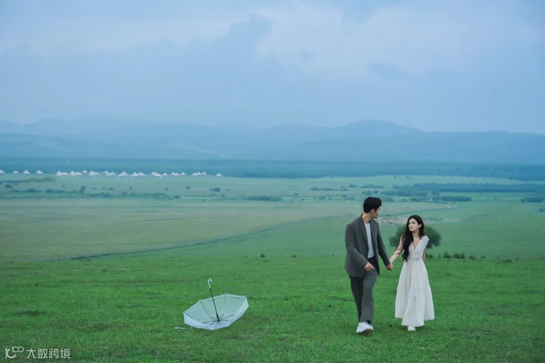 阴雨天气,为拍摄增加了难度,但也营造出难得的氛围感。首先是人物的造型,女生的白衣长裙搭配男生简约的西装,以简洁的透明雨伞做点缀,让人物与草原景色融为一体的同时又散发出脱俗的时尚气息。