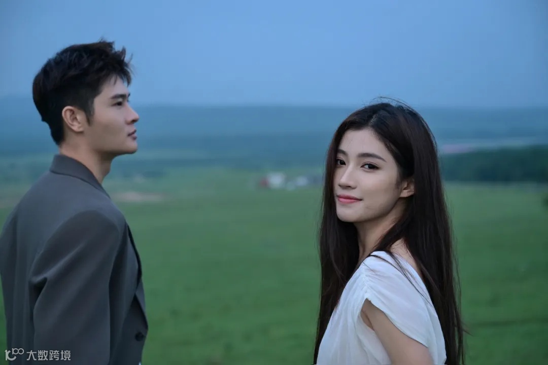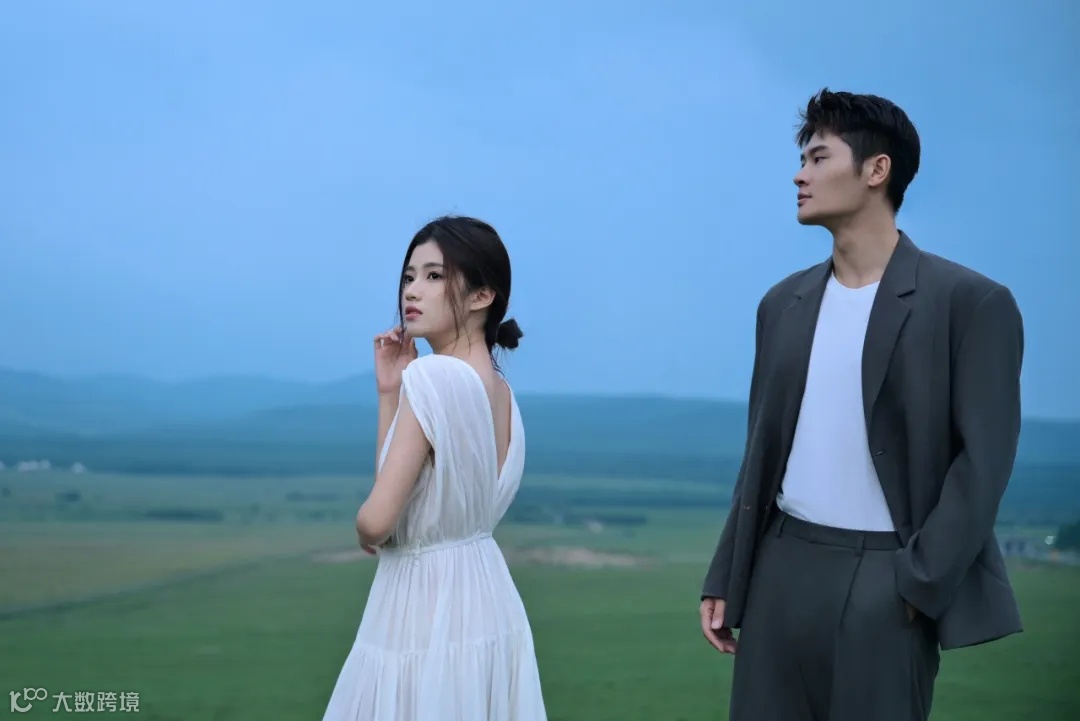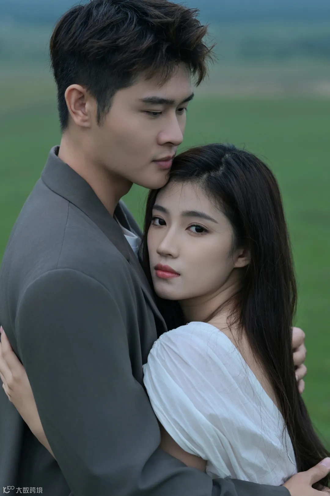 阴雨天气,为拍摄增加了难度,但也营造出难得的氛围感。首先是人物的造型,女生的白衣长裙搭配男生简约的西装,以简洁的透明雨伞做点缀,让人物与草原景色融为一体的同时又散发出脱俗的时尚气息。