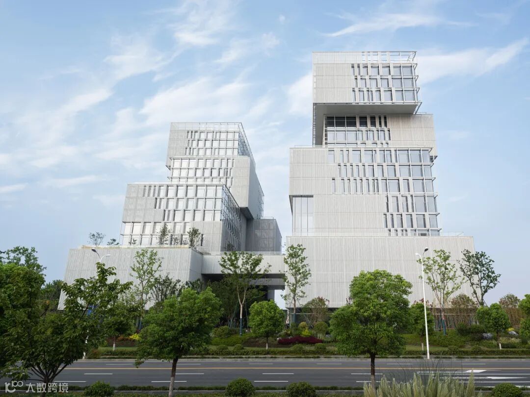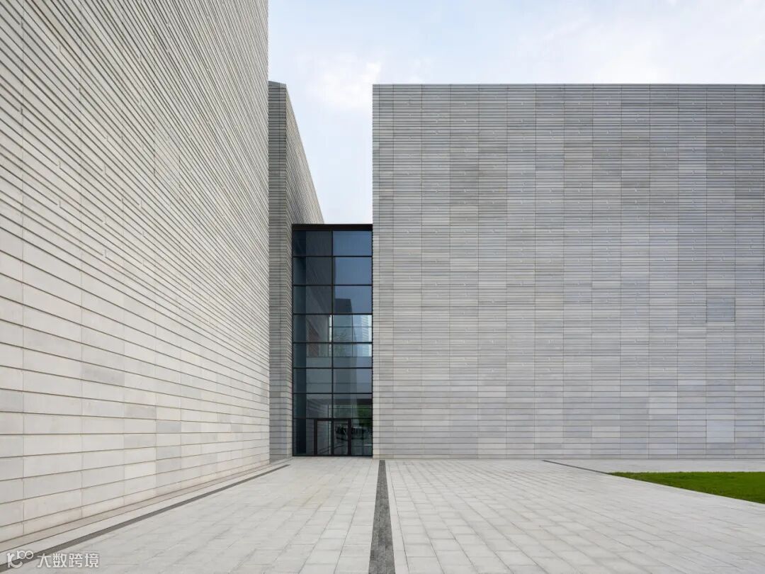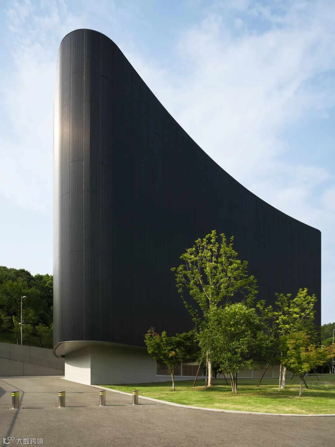 华茂艺术教育博物馆建筑大部分体量由黑色波纹铝板覆盖,同时整体的悬挑设计又使上部体量漂浮在倾斜的场地上,赋予了建筑强烈的雕塑感和重量感。