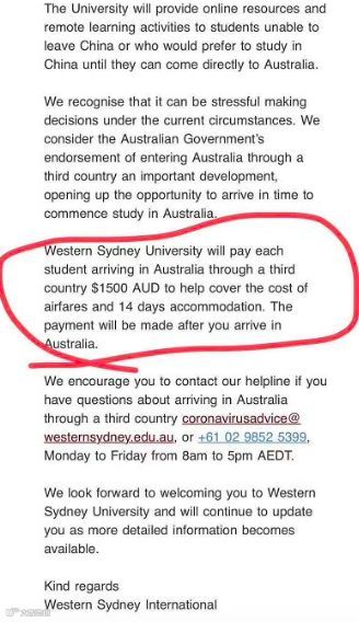 根据网上流传的一封邮件截图显示,西悉尼大学将向那些从第三国返澳的中国留学生发放1500澳元....
