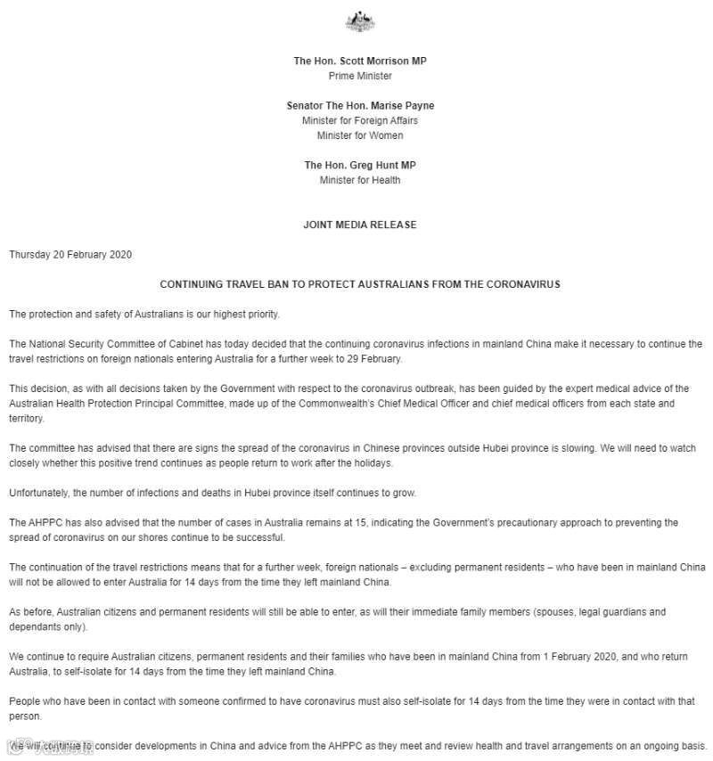 内阁国家安全委员会今天决定,由于中国大陆的感染冠状病毒,有必要将外国公民进入澳大利亚的旅行限制再延长一周,延长到2月29日。