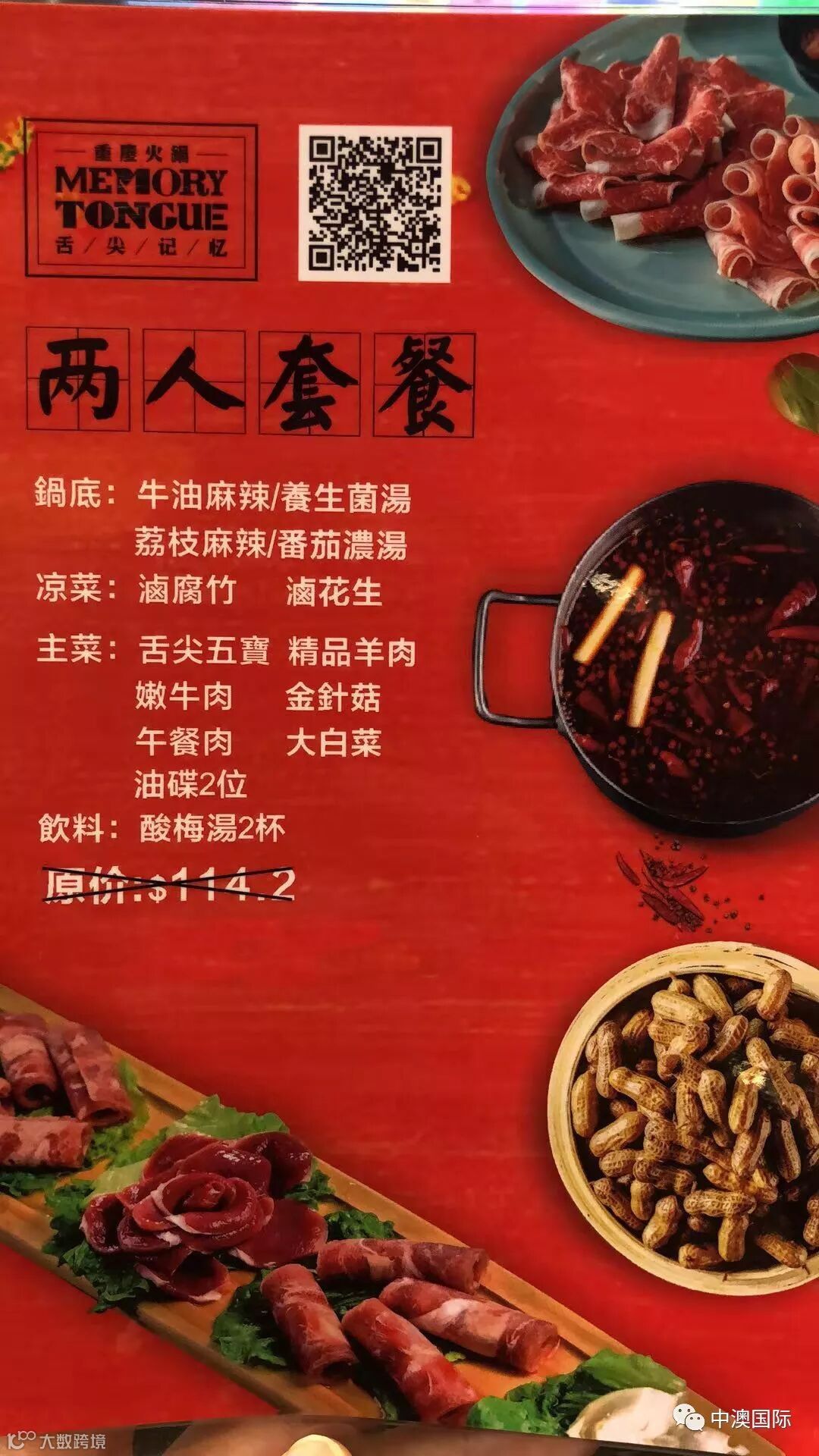 将获得价值$114舌尖记忆的火锅代金券&气泡酒一瓶