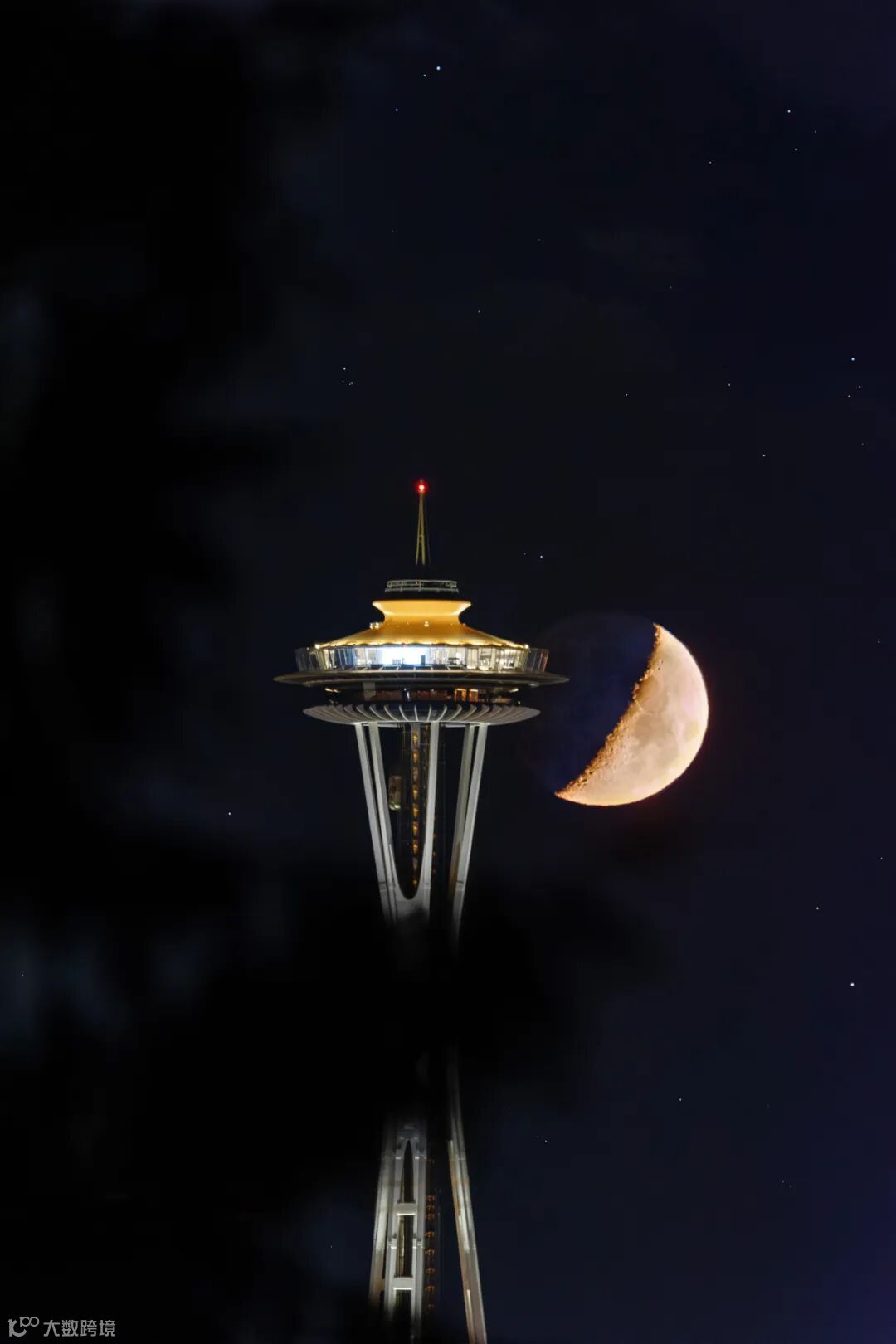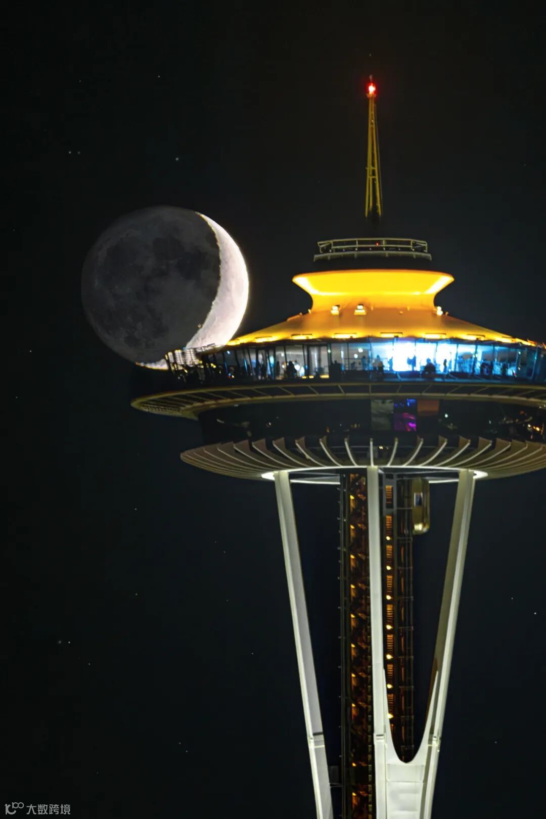 我所在城市,因为冬季时常是阴雨天,所以在一年内能拍摄满月的机会不多,再加上我想要拍摄到满月与这个城市的标志性建筑——Space Needle太空针同框的照片,更是难上加难,所以每一次满月,都是我不想错失的机会。
