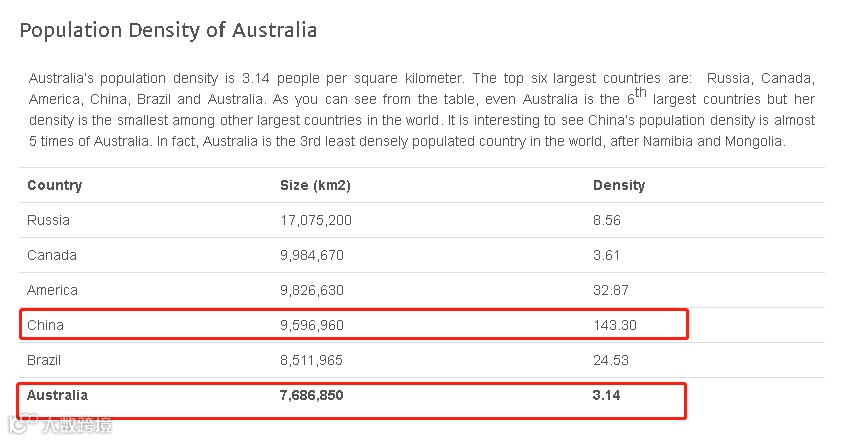 中国的人口密为143.30(每平方千米平均有143.3人),而澳洲的数据仅为3.14,人口总数排名为全球第56名。