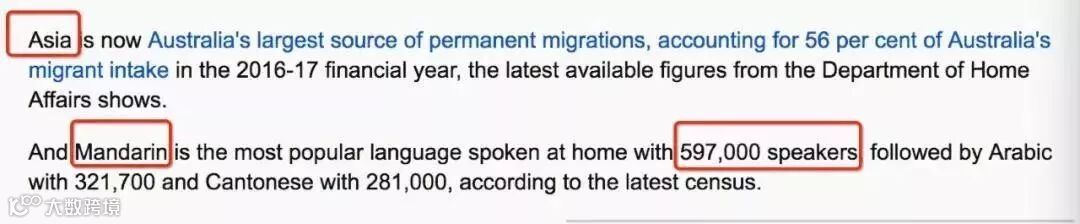 据澳大利亚研究咨询委员会发布的最新人口报告显示,使用汉语普通话的人数占总人口的1.5%以上,普通话已经成为了澳大利亚最受欢迎的语言,有59.7万人在家说汉语。