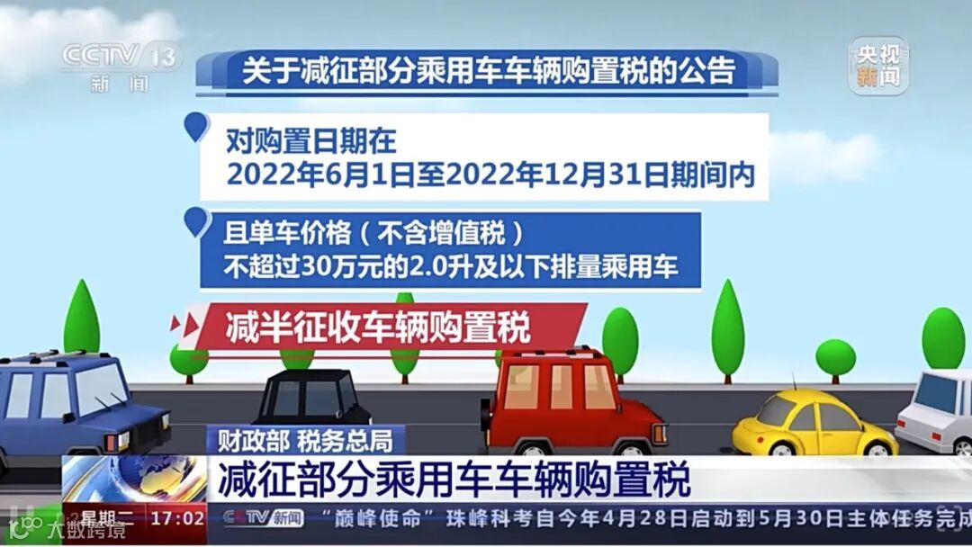 5月23日,国务院常务会议部署了6方面33项稳经济一揽子措施,其中明确要求“放宽汽车限购,阶段性减征部分乘用车购置税600亿元”。5月31日,这项举措靴子落地,财政部、税务总局联合发布,对购置日期在2022年6月1日至2022年12月31日期间内且单车价格(不含增值税)不超过30万元的2.0升及以下排量乘用车,减半征收车辆购置税。