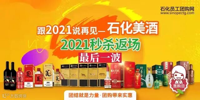 石化员工团购网从本周开启年货团购系列活动,首期年货“石化美”酒2021惠购秒杀返场最后一波!让我们存几箱“石化美”酒,跟2021说拜拜。