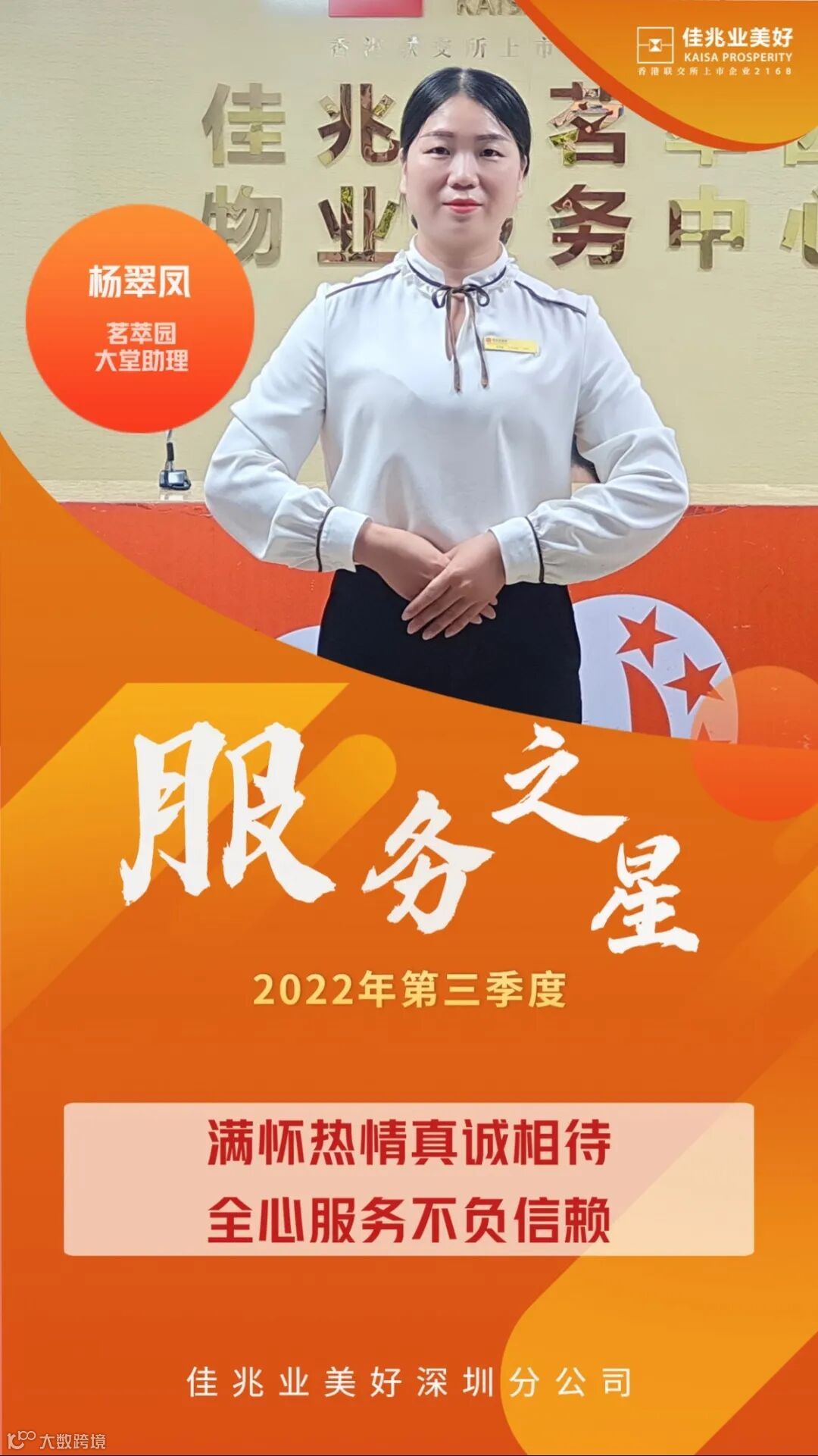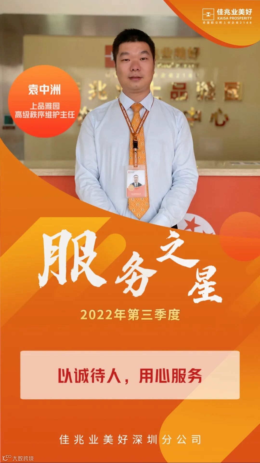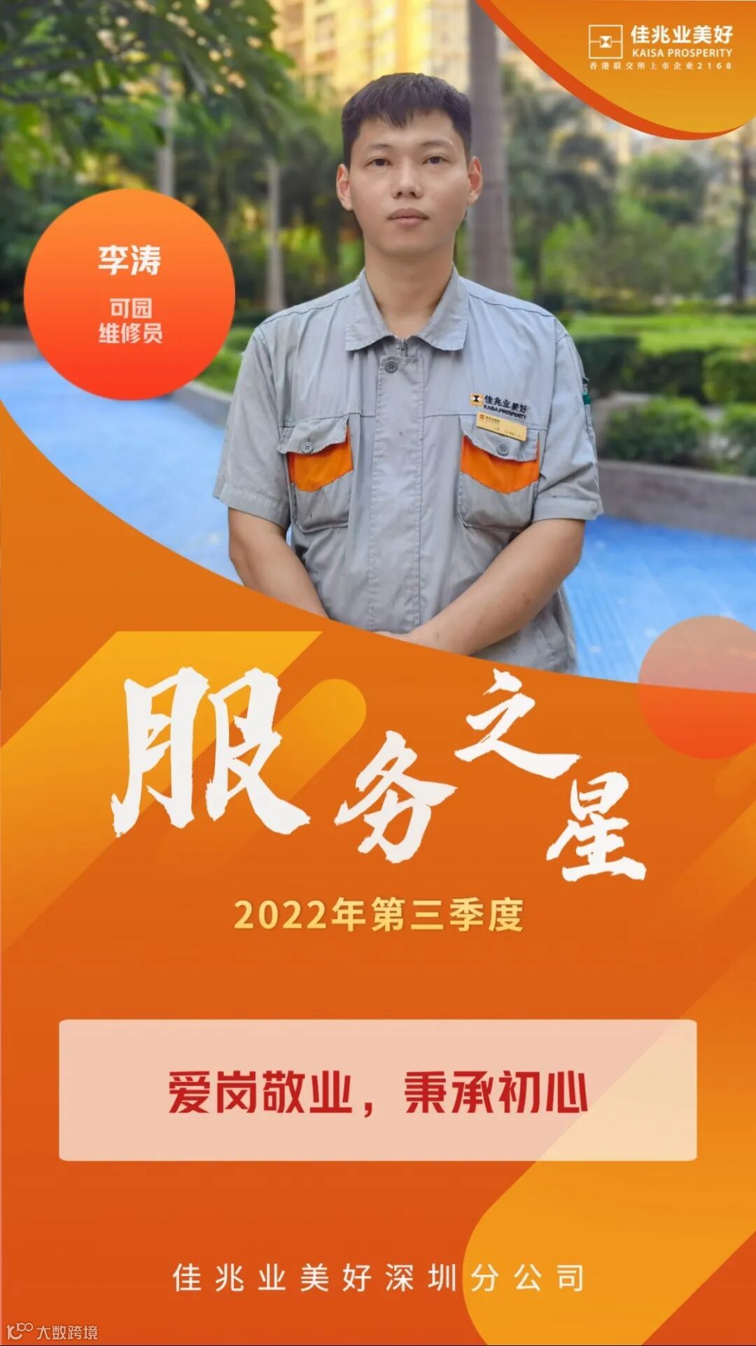 日复一日,年复一年,服务与热忱从未停歇,每一位“佳”人在平凡的岗位上,兢兢业业,用心服务,为守护家园、持续赋能美好生活而不懈努力,用行动诠释服务初心。佳兆业美好深圳分公司2022年第三季度服务之星,他们的用心与努力值得被肯定。