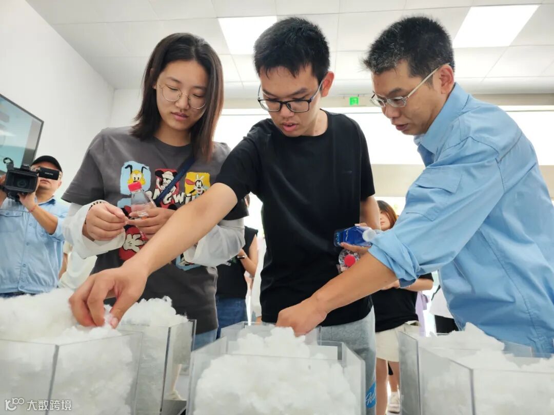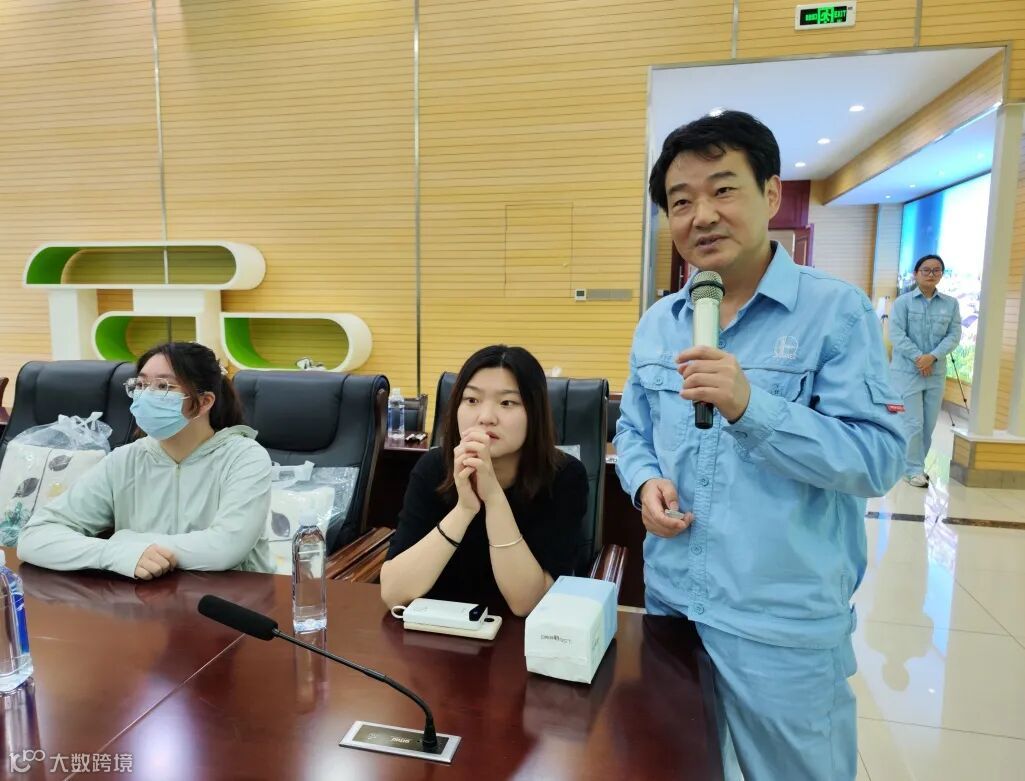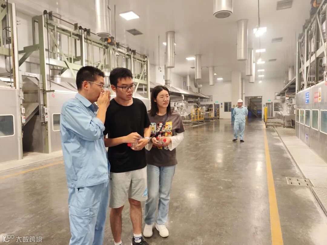 随后,同学们来到合纤一部短纤六装置。在装置门前,在该装置前纺工作的职工郑金龙迎来了自己上大二的儿子郑言和上大一的外甥女徐慧浏,郑金龙带着他们参观了正在生产的短纤产品、自动化生产设备和洁净化生产车间。