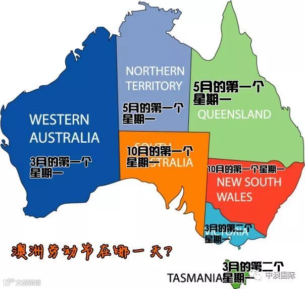 澳大利亚不同州的劳动节时间不同,不过按照规定,劳动节当天都会休假一天。西澳劳动节3月5日,维州和塔州3月12日。