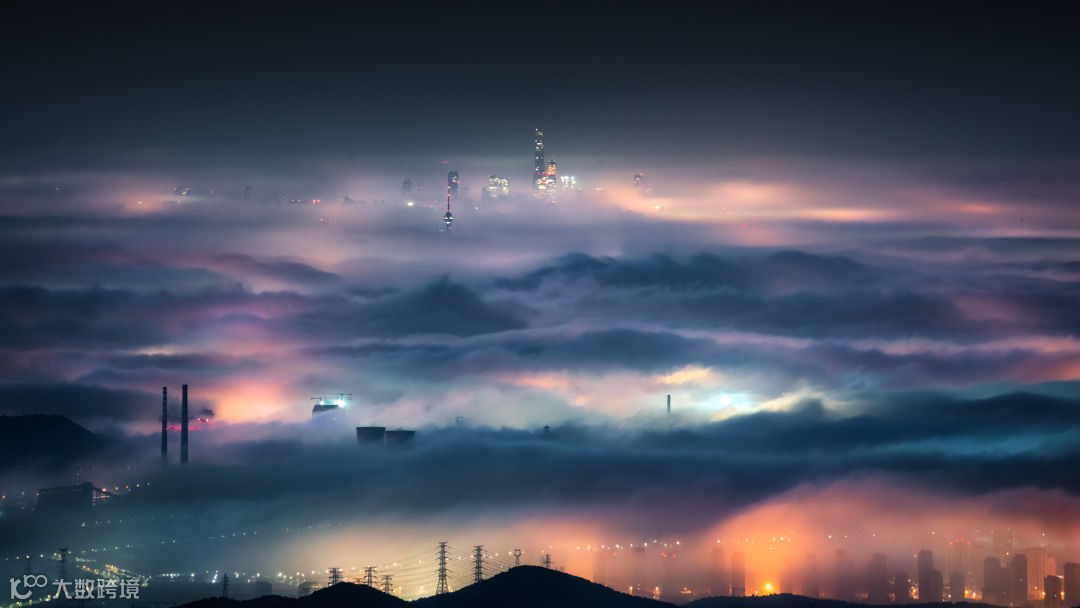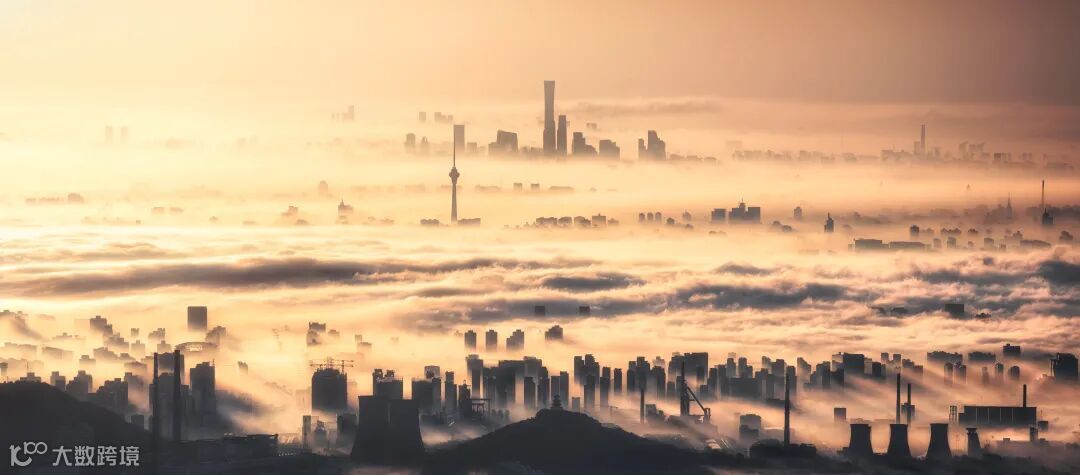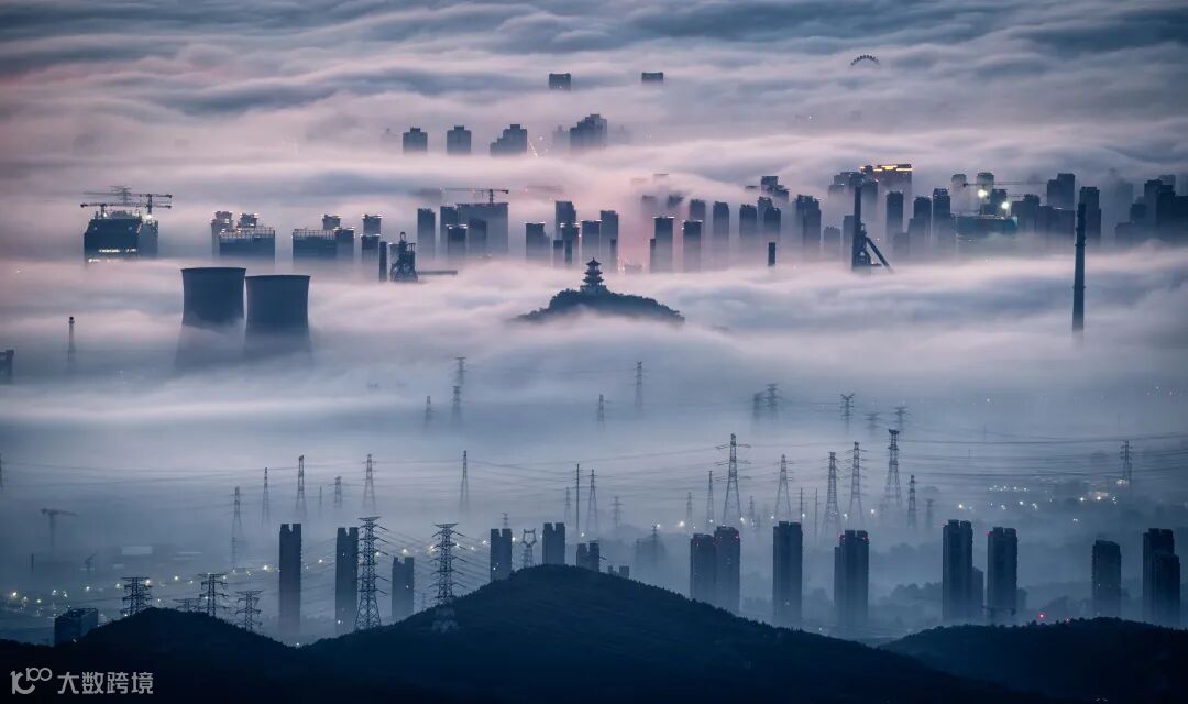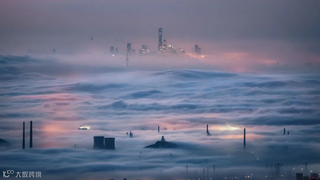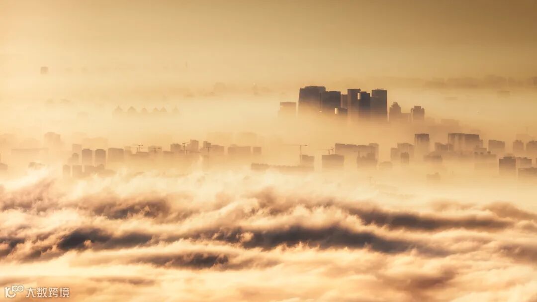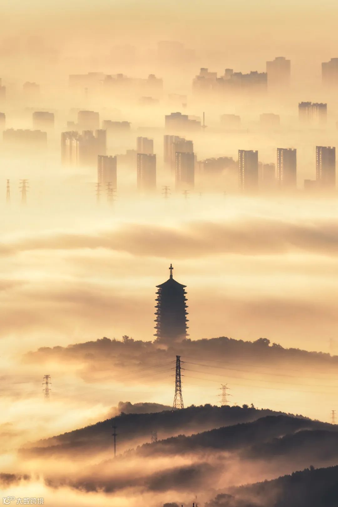 夜色逐渐褪去,天蒙蒙亮起,此时的云海已然平静了许多,远处的国贸CBD与近处的工业园若隐若现,好似海市蜃楼的场景。