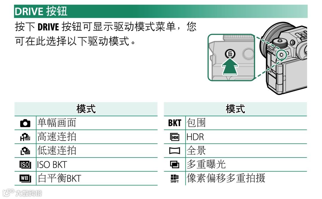 富士相机的多重曝光功能只需要在“DRIVE”按钮中进行选择设置即可调用,十分便捷。