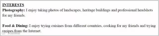 一般来说,简历里都会包含这些东西。我建议你只写"兴趣"部分,你不需要其他部分的内容帮你找到一个柜员的工作。在这一部分,列出你的3种兴趣并用一句话分别描述。兴趣可以是烹饪和摄影这样简单的描述,可以写得长一点,这样雇主能知道你的能力。你也许会因为能够开发他们的菜单或者给食物拍出好看的照片并放到社交媒体上而被雇用。