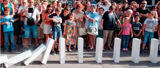2公里長的城市多米諾在墨爾本市中心穿梭,進入大教堂,倒入藝術中心,穿過廣場,跌過大橋,沿著河岸,一路傾倒……