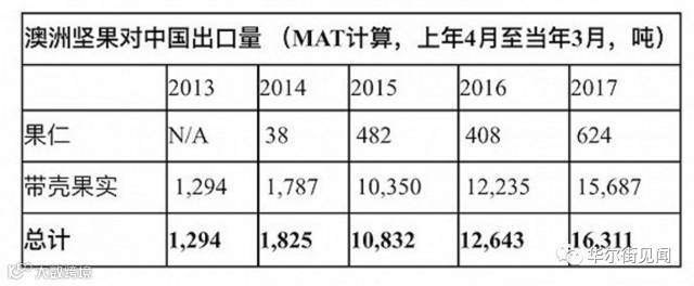 根据第一财经提供的详细数据,2012年4月至2017年3月间,澳洲坚果对中国出口量从1294吨上涨到16311吨,增长11.6倍。其中,爆发性的增长开始于2015年,这一年的销售数字达到了前一年的近5倍。截至2016年底,中国市场已占据澳洲坚果全球出口市场的近三分之一。