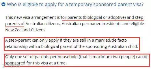 ❹同一时间只有一对父母可以被担保。比如亲生父母离婚然后各自再婚,担保人等于有了两对父母,理论上这4个人都可以同时申父母移民的。但是如果申请这个临居签证的话,同一时间内只能有一对可以申请!组合可以是亲父+亲母,亲父+继母或者亲母+继父