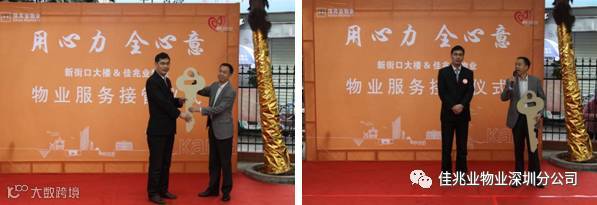 在交接环节中,新街口业委会主任将管家金钥匙双手交至佳兆业物业深圳分公司总经理扶振兴手中,扶总代表佳兆业物业深圳分公司对广大业主承诺,在正式接管后,将秉承佳兆业物业“用心力·全心意”的服务理念,全心全意为新街口大楼全体业主提供高品质的物业服务,为小区带来全新面貌。一句:“让业主满意、让公司放心、让政府放心”,将仪式气氛带入高潮。