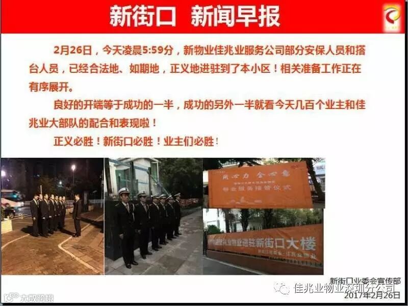 根据佳兆业物业管理集团战略部署,2017年为拓展年,各物业分公司全面开展项目拓展工作,捷报频传。近日,在佳兆业物业签订南山区新街口大楼物业服务合同后传来成功接管的好消息。2017年2月27日上午10:00,在深圳市南山区新街口大楼广场,接管仪式准时开始,新街口大楼上百名业主一同见证了这一激动人心的时刻。